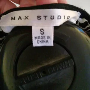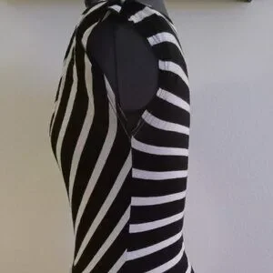 Size small by Max Studio, black and white striped, short sleeved shirt. Scooped, cowl neck collar in the front. Wrapped design with comfy and stretchy material. Rouched design on one of the sides and in great condition!