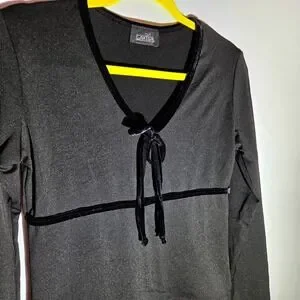 Malibu Y2K Black Long Sleeve V-Neck Velvet Trim Tie Front Top Womens Small