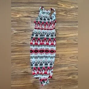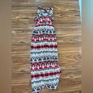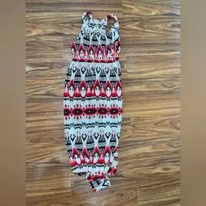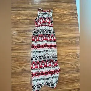 This sleeveless sundress features a striking red and black color palette with a plunging neckline, perfect for casual or resort wear. The lightweight fabric and intricate geometric patterns make it a standout piece for any summer outing. multicolored comfortable slinky dress. In excellent condition and perfect for warm sunny days . Size 10