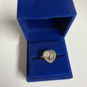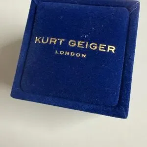 Chic Kurt Geiger ring with a heart-shaped centerpiece. Gold band with green detailing. Perfect for adding elegance. This item is being sold as-is and may show various signs of use, including but not limited to rubs, discoloration, scuffs, scratches, peeling, stains, tarnish, color transfer, pen marks, coin residue, or general wear and tear.