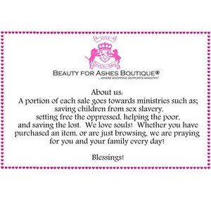 Please note: Beauty for Ashes Boutique® and Beauty for Ashes® carries t-shirts, worship flags, clothing, jewelry and accessories; many with our trademark brand name 'Beauty for Ashes' - which means God will restore Beauty in place of life's ashes - Isaiah 61:3. None of our items carry literal ashes. Instead, our items carry the blessings of God representing restoration and divine destiny for each individual.