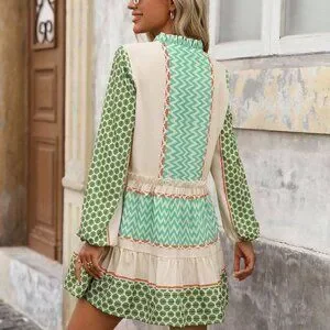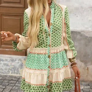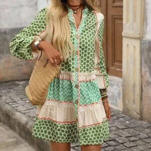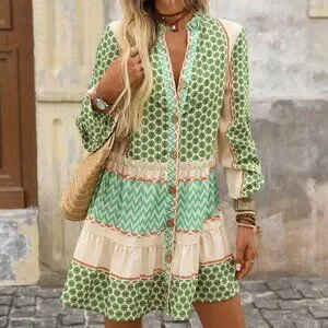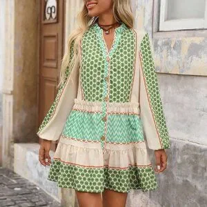 Green Boho Women's Floral Wavy Striped button down Lantern Sleeve mini dress