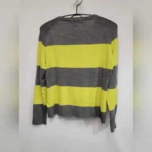 French Connection Womens Size Large Long Sleeve Crewneck Colorblock Sweater. Lime green and gray colorblock stripes, 88% acrylic 11% polyester 1% elastane, rib knot cuffs hem, and neckline.