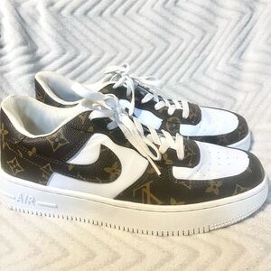 Low-top lace-up sneakers with white leather panels and brown monogram-print overlays. Thick white rubber sole with subtle embossed AIR detailing. Clean, fashion-forward casual style.