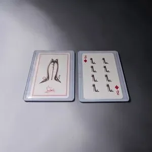 Stylish playing card featuring iconic Louboutin design. Striking red and white colors.