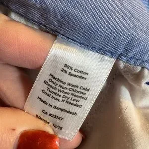 Mid-rise silhouette with front button and zip closure. Lightweight fabric with 2% Span for warm days.