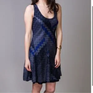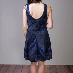 This vintage Free People My One & Only mini dress is in very good condition and features an intricate indigo and black zigzag chevron design. The flattering fit and flair tank-style silhouette, along with rich patterns and colors, makes it perfect for a sunny day, a festival, or layered with tights and a cardigan for a cozy fall or winter look. The top woven layer is semi-sheer and is fully lined with a soft layer underneath. Made of 100% polyester, it is machine washable on a gentle cycle and can be tumble dried on low. The dress is very stretchy and comfortable. Measurements are approximately 18.5 inches across the bust and 35 inches in length when laid flat.