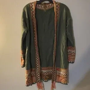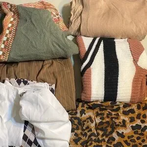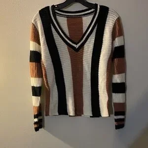 Two-piece look: white puff sleeve blouse with long neck ties and an argyle print crop overlay. Overlay features brown and black diamond pattern. Feminine and preppy styling. Lightweight woven and knit mix. Bundle good condition.