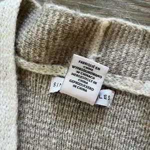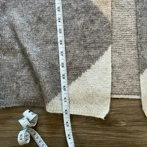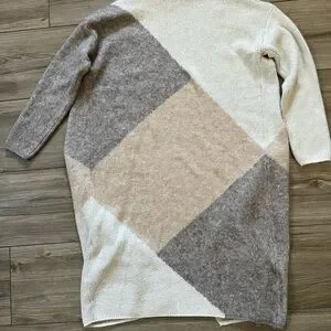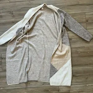 Soft knit longline cardigan with open front. Geometric block pattern in neutral tones. Lightweight and cozy layering piece. Simple silhouette with long sleeves.