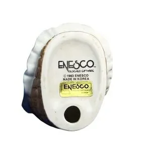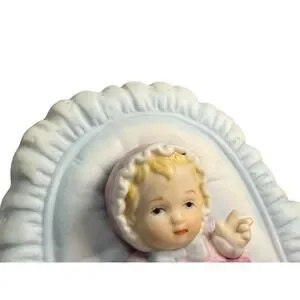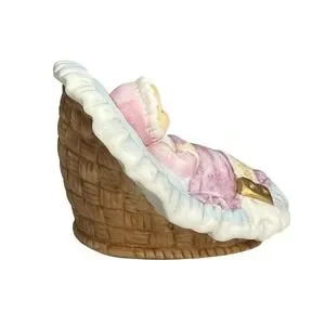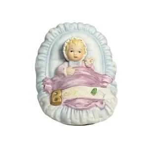 Adorable vintage 1983 Enesco Designed Giftware ceramic baby figurine, made in Korea. Features a sweet blond baby tucked into a pink blanket with gold "B" Baby lettering and soft pastel detailing. A charming collectible piece perfect for a nursery, baby shower gift, or Enesco collector.