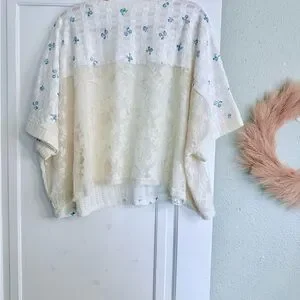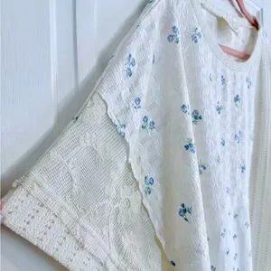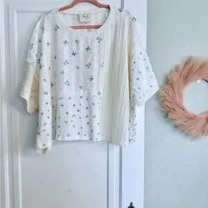 Lightweight cream blouse with small blue floral print. Boxy, relaxed fit with mixed-texture patchwork panels. Short sleeves and round neckline. Soft, airy fabric for casual wear. NEW