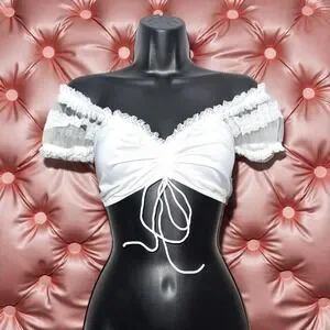 Keywords: ruched top, off shoulder, lace trim, puff sleeve, crop top, drawstring, girly, romantic, coquette, sheer sleeve, festival wear