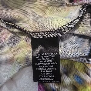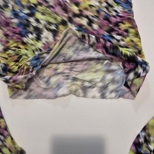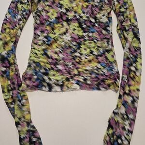 This vibrant AFRM top features a bold, multicolored print with long sleeves, offering a lively and energetic aesthetic. Pair it with a sleek leather skirt or trousers to balance the vivid pattern for a striking ensemble.