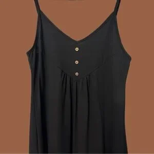 A sleek black midi slip dress with thin straps and subtle pleating and button detail at the front. Lightweight and flowy for comfortable all-day wear. Versatile piece that layers easily and transitions from casual to dressed-up looks. Never worn - NWOT!