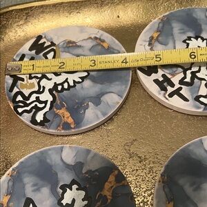Set of four marble coasters featuring a unique horse design. Blue and gold accents add elegance.