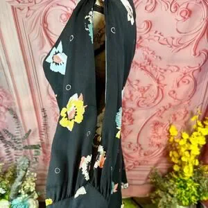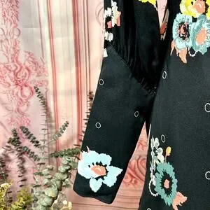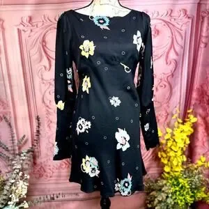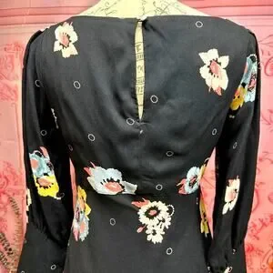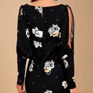 Washed black woven fabric holds a dreamy pink, sage green, yellow, and grey floral print over a bateau neckline, and long slit sleeves with fitted cuffs.