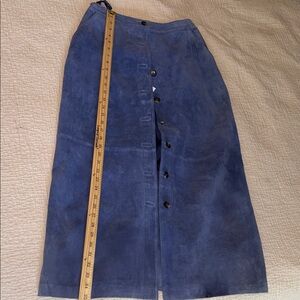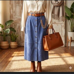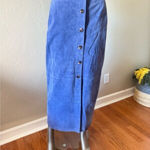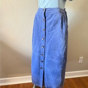 Genuine suede button-front midi pencil skirt with elastic back waist. New w/o tags. Perfect for any occasion, this skirt offers a chic and versatile look that can be unbuttoned to show a little leg or your favorite boots. Partially lined. You have seen these skirts for several hundred dollars or even thousands at the design houses. Now you can have a new vintage one in trending powder blue suede at an affordable price. Two front slash pockets. Size 10. See measurements in photos.