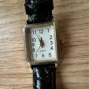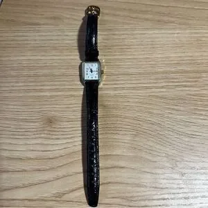 Classic small profile watch with leather mock croc band. Face on metal has faded from gold to silver. Otherwise great condition. Working battery