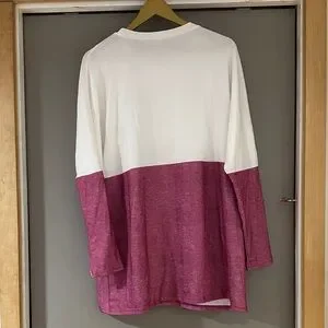 Designed with a relaxed, oversized tunic fit, this piece offers all-day comfort while still feeling fun and unique. The soft colorblock design in cream and heathered mauve gives it a trendy yet easy-to-wear look, while the front pockets add both function and charm.