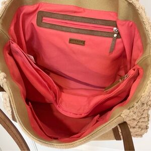 Such a cool boho tote! This Steven by Steve Madden bag has a very roomy interior (lots of pockets!) in a fun coral pink pop of color. The exterior is textured like a carpet bag, and is adorned with silver beads, coins and tassels over the hidden magnetic closure. It’s in EXCELLENT used condition with no tears or stains, and comes from a smoke-free home.