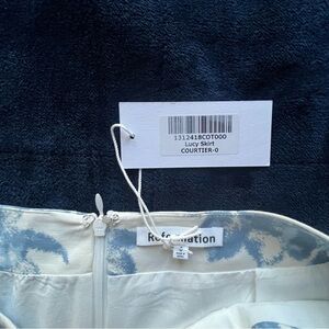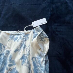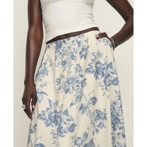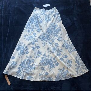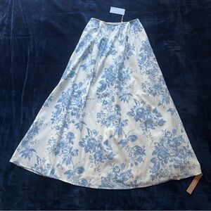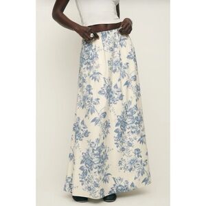 Reformation white and blue floral maxi skirt. Called the Lucy Skirt in the Courtier print. Full length, has pockets at the hips, fully lined, back zipper with hook and eye closure.