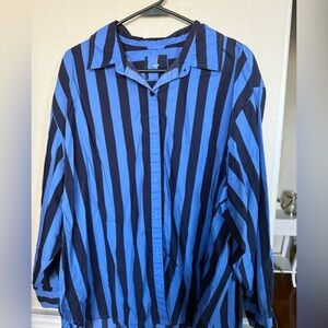 Relaxed-fit button-down shirt with bold vertical stripes. Lightweight, breathable fabric for easy wear. Classic collar and full button front. Versatile style for casual or smart-casual looks. Its a oversized american eagle top large its brand new it has a defective tiny little 2 stain not noticeable at all because of the pattern of the shirt please see pictures to make sure 100% cotton