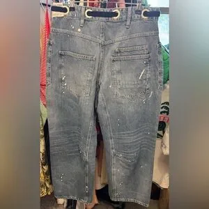 Features: Distressed detailing throughout, paint splatter features, oversized patch pockets, contrast drawstring waist, pull-on style