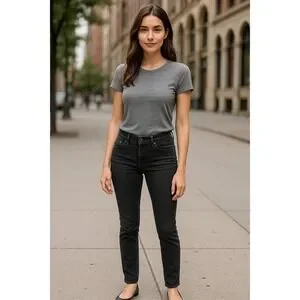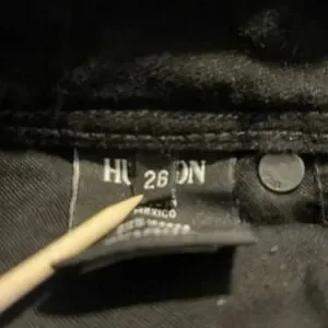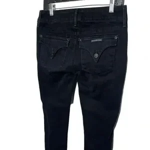 Hudson black skinny jeans, size 26, made in Mexico from a cotton-spandex blend for comfort and stretch. These premium denim jeans feature a double-button waist, mid-rise fit, and signature Hudson flap back pockets with button closures for a flattering silhouette. The black wash makes them endlessly versatile—perfect for everyday wear or dressing up for a night out. Style them with a tucked-in tee, cropped sweater, or leather jacket for a chic, timeless look. A wardrobe essential that pairs seamlessly with heels, boots, or sneakers.