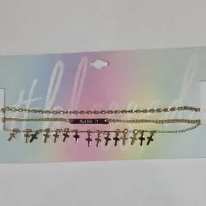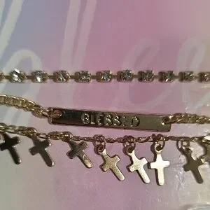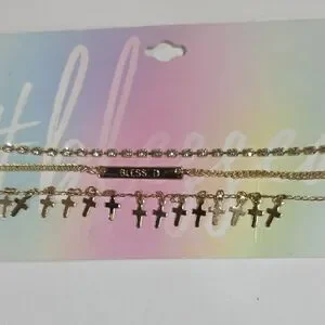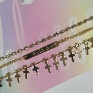 Elegant layered gold necklace set featuring a “Blessed” charm, cross pendant, and Crystal shimmering gem accents. A faith-inspired piece designed for everyday elegance or meaningful gifting.