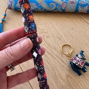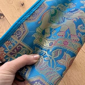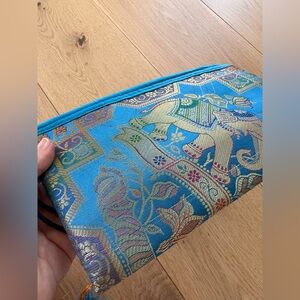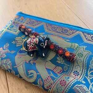 I bought this in India. Brand new and in excellent condition. Silk clutch/pencil case/pouch along with a colorful glass mosaic covered pen and a paper mache’ elephant keyring. Selling as a set.