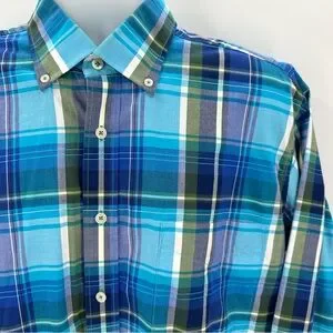 Blue plaid 100% cotton button down shirt features single front chest pocket, collared neckline, and flip-cuff long sleeves. Mens tag size L.