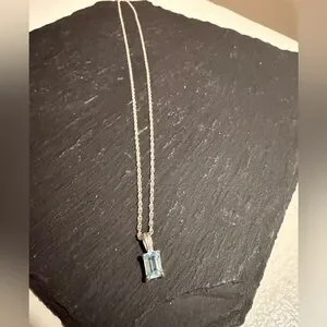 Elegant sterling silver pendant necklace featuring a light blue emerald-cut aquamarine stone, paired with a diamond-cut rope chain for extra shine.