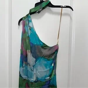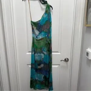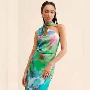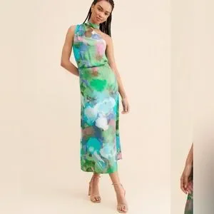 One-shoulder abstract printed dress in midi silhouette