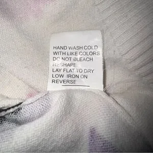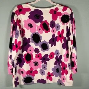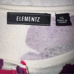 This is an Elementz women's floral button-down cardigan sweater. The sweater has a white base with a large, vibrant floral print in shades of pink, purple, and black. It features a crew neckline, three-quarter length sleeves, and a front button closure with white buttons.