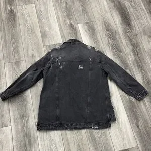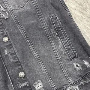 Edgy jean jacket with distressed details. Button front and classic collar. Features chest pockets.
