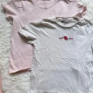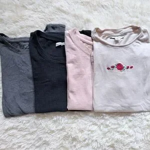 Set of four short sleeve tees. Includes gray, black, pink with floral embroidery, and cream. Soft and comfortable.