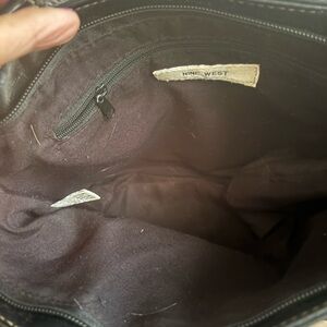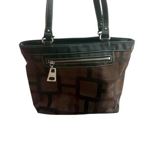Stylish Nine West tote with geometric brown pattern. Black trim and handles add contrast. Top zipper secures belongings. Compact shape for everyday use. Polished hardware detail.