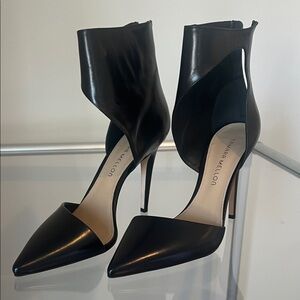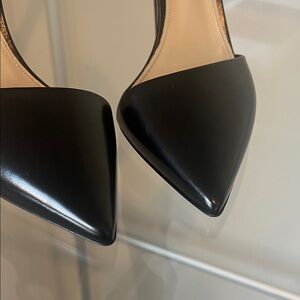 Pointed pump with sexy ankle coverage. Sleek kidskin leather upper. Elevate a work look or evening out. The d'Orsay style cut-out sides add a touch of contemporary flair to your ensemble. 4” heel