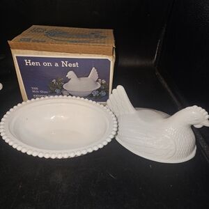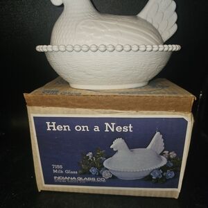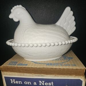 Here is a listing for this vintage milk glass hen on a nest with it's original box. The hen is in great condition too. From the Indiana glass co.