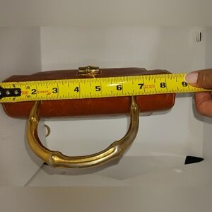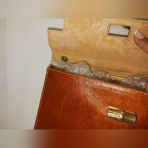 Rare Vintage FURLA structured kelly-like bag from the 70s. Measurements are shown in pictures. Timeless cognac brown leather & antique brass finish top-handle bag with polished gold-tone hardware. Smooth leather exterior with a secure front turn-lock closure. Structured silhouette ideal for refined everyday wear. Elegant gold handle adds a sophisticated touch. Surface scratches and interior suede cracking is shown in pictures. Please review thoroughly before bidding or sending an offer.