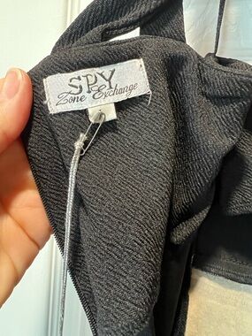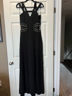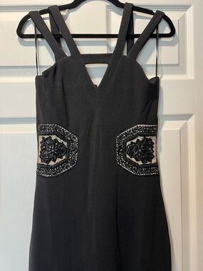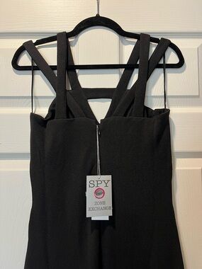 Chic black dress with a V-shaped neckline by SPY Zone Exchange. Dual structured straps for a modern look. Decorative beaded and embroidered panels at the waist add texture and shine. Sleek silhouette suitable for evening wear. Brand new with tags. 15.5” pit to pit, 14.5” across waist, approx 62” shoulder to bottom