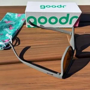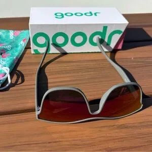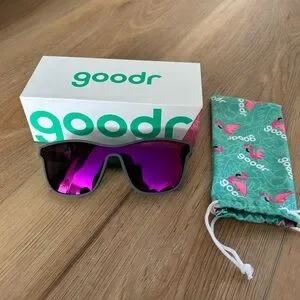 Sporty oversized sunglasses with vibrant purple mirrored lenses. Black frame. Includes branded goodr box and patterned drawstring pouch. Bold reflective color for statement sunnies.