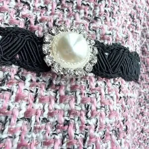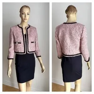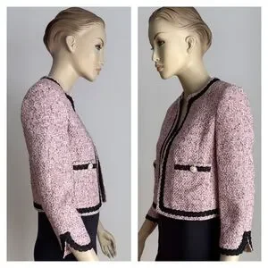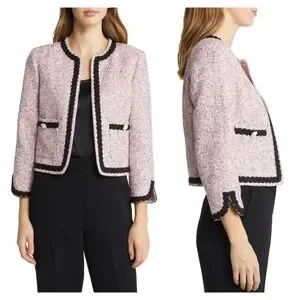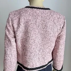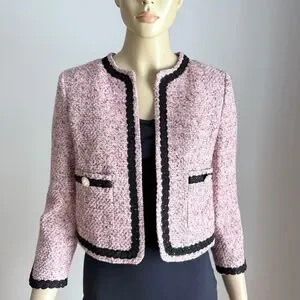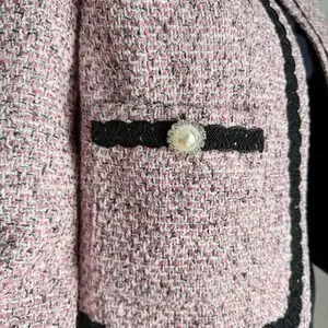 This collarless, cotton-kissed tweed jacket features a pale pink color with a metallic sheen and is adorned with regal braided trim.