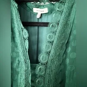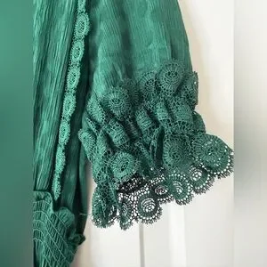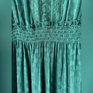 Max Studio tiered short sleeve dress. Size small. V-neck with panel insert. Tons of detail like shadow polka dots, ruffles, and lace. Smocking at waist and breezy skirt for an easy fit. Fully lined. Ruffly and feminine in a gorgeous jewel tone emerald. Excellent condition.