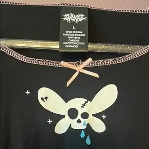 The Dark And Cutesy SWIXXZ edgy streetwear graphic t-shirt comes in a cropped, long sleeve construction with a black colorway featuring pink contrast stitching and a screen-printed graphic on the front of a crying