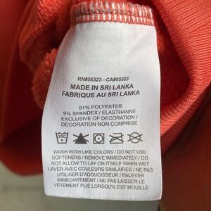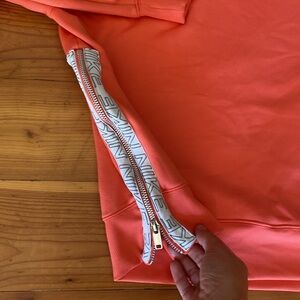 This has such a cute fit for those that like the oversized comfy look. Previously worn by me for evening golf mainly. Cozy little fleece backing kept me warm and the oversized fit provided room for my swing. Laundered and ready for the next person. Previously and gently worn. No stains or rips to disclose.