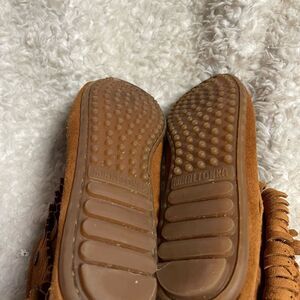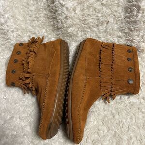 Womens Minnetonka leather Suede Double Fringe Indian Moccasin Ankle Boots SZ 10. Side zipper, pre owned in good used condition.signs of wear on the suede. See all pictures any questions please message.B12