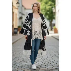 Elevate your wardrobe with the Women's POL Black & White Peace Sign Duster Jacket. This stylish piece combines comfort and flair, making it perfect for any occasion. The eye-catching peace sign design not only expresses your individuality but also adds a unique touch to any outfit. Made from high-quality materials, this duster jacket ensures durability and a flattering fit that complements various body types. Whether you're dressing up for a night out or adding layers to a casual look, this versatile duster is your go-to choice. Its 100 percent cotton fabric makes it easy to wear year-round, while the open front allows for effortless layering. Don’t miss out on this trendy addition to your closet!