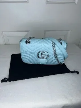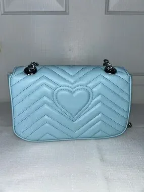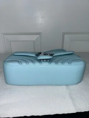 Stylish light blue quilted shoulder bag with a silver double-G logo and chain detail. Smooth finish and adjustable strap for versatile wear. Elegant silver hardware complements the soft blue color for a polished look. Envelope flap closure with push button lock. One interior zipper pocket.