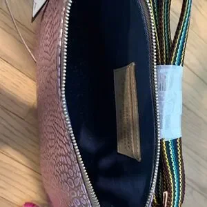 Eye-catching Consuela crossbody in a metallic rose pebble texture. Removable crossbody strap and wristlet loop for versatile carry. Zip closure secures essentials. Colorful tassel charm adds playful detail.